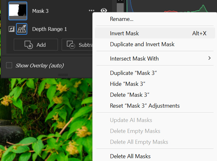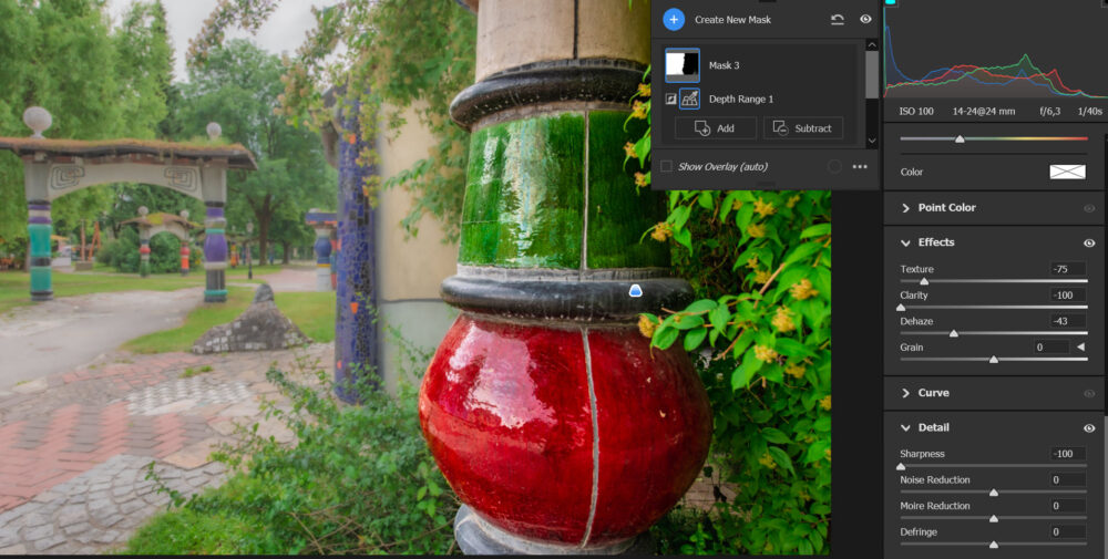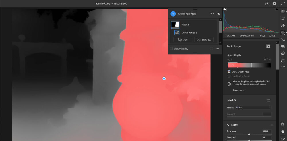 Ha megvan a maszk, szabadon állíthatod az expozíciót, a színeket vagy akár a Dehaze (Ködmentesítés) mértékét csak az adott mélységben. A …-ra kattintva készíthetsz másolatot a maszkból, vagy meg is fordíthatod, így külön szerkesztheted az előtér és háttér részt.