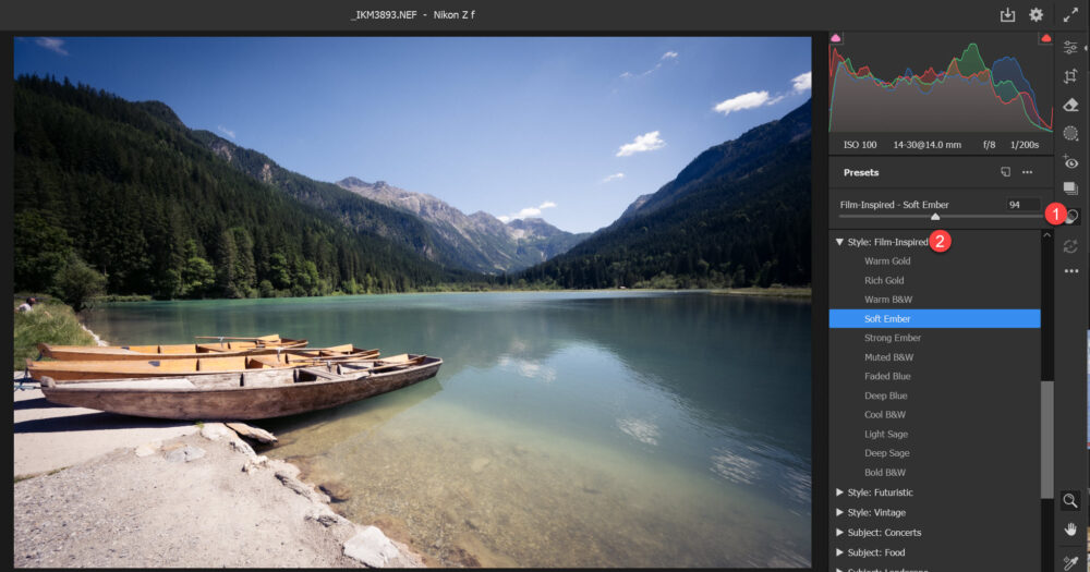 Aki szokott preset-eket, azaz előre elkészített beállításokat, az biztos örülni fog az újaknak is. A klasszikus analóg inspirálta ezeket, és az amount csúszkával 0 és 200% között állítható, hogy mennyire legyen hangsúlyos a filmes jelleg.