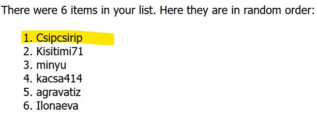 Mr. Randomnak kevés dolga akadt, mert minyué a 10, Tundochkáé a 15 $-os utalvány, csak a24-es Bingóért kellett sorsolnia. Aki a 20 $-os utalványt nyerte: