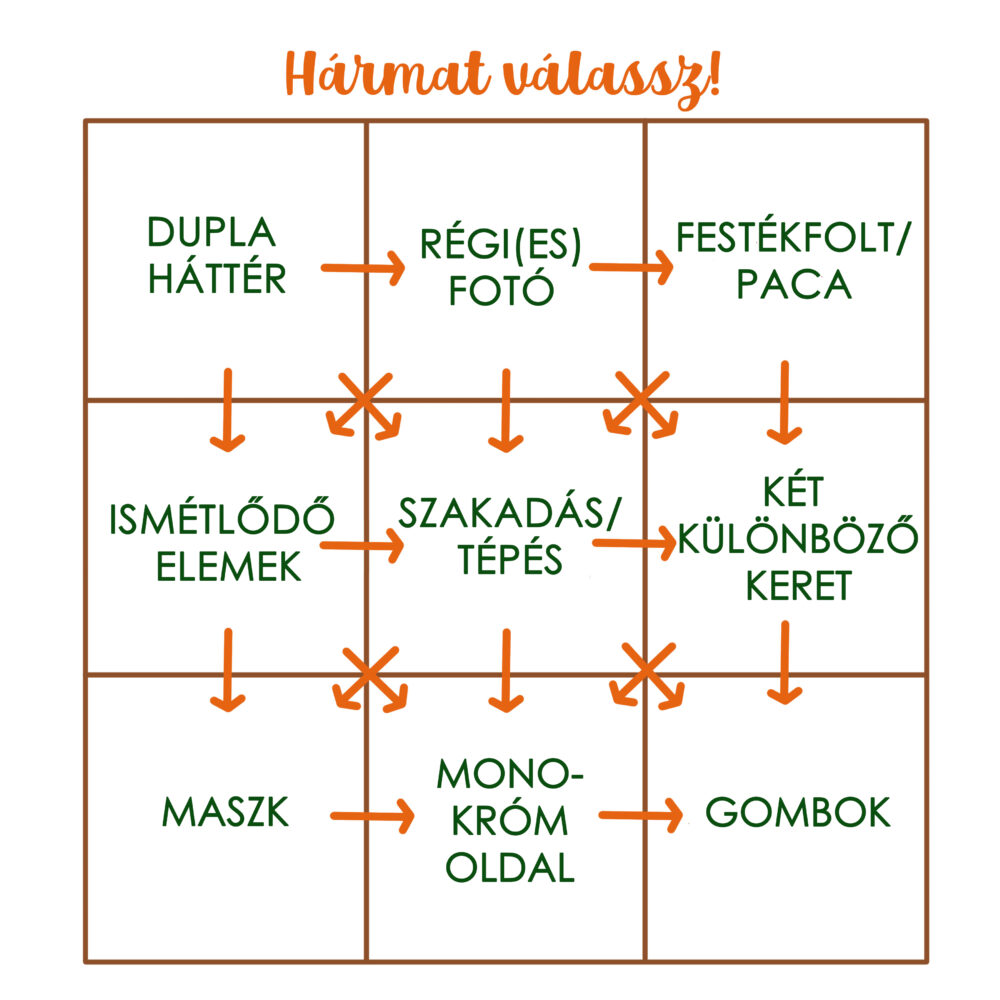 A megadott táblázatban indulj el bármelyik mezőről, és a nyilaknak megfelelő irányokban lépj tovább kétszer. A három megadott feltétel szerint alkoss oldalt, minden más részlet Rád van bízva.
