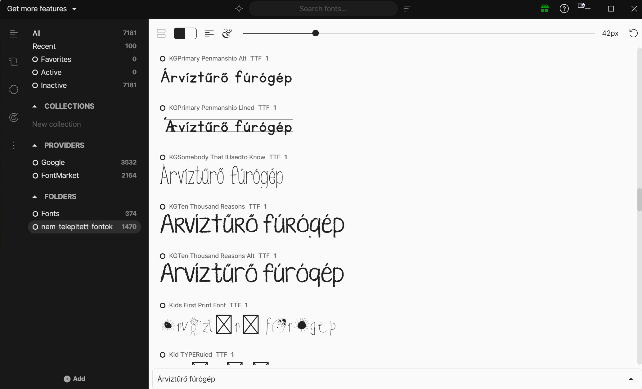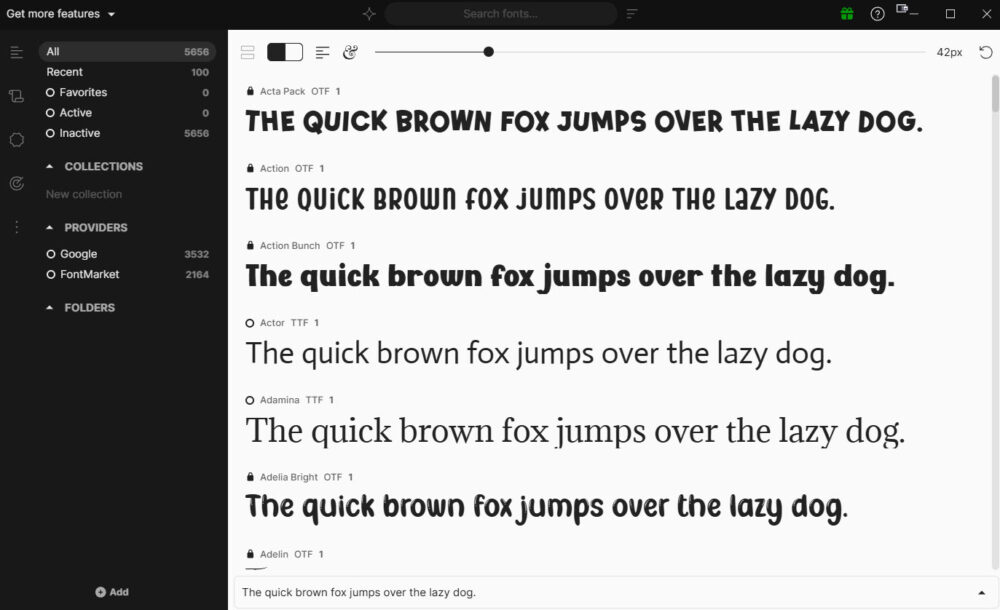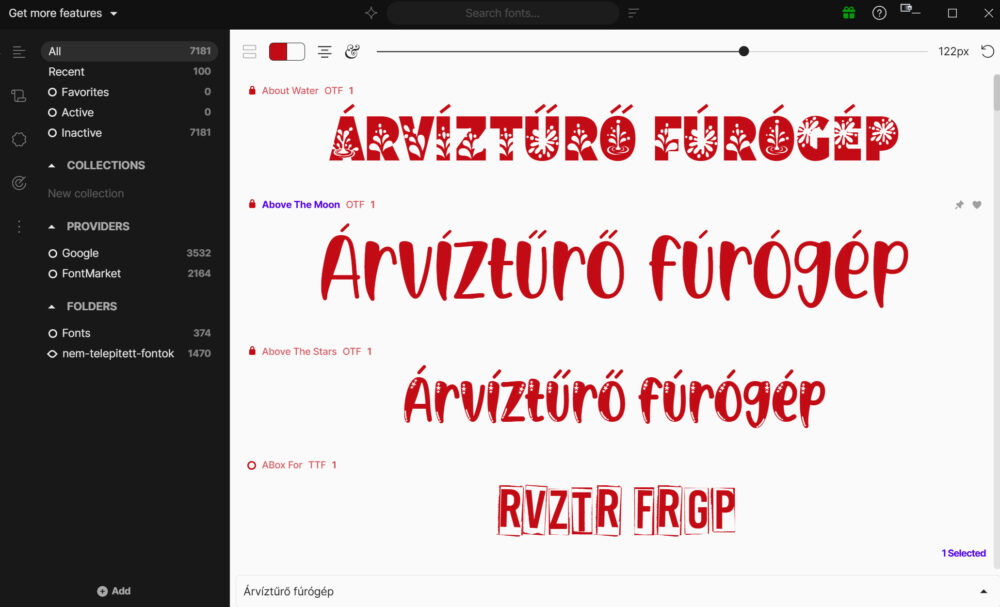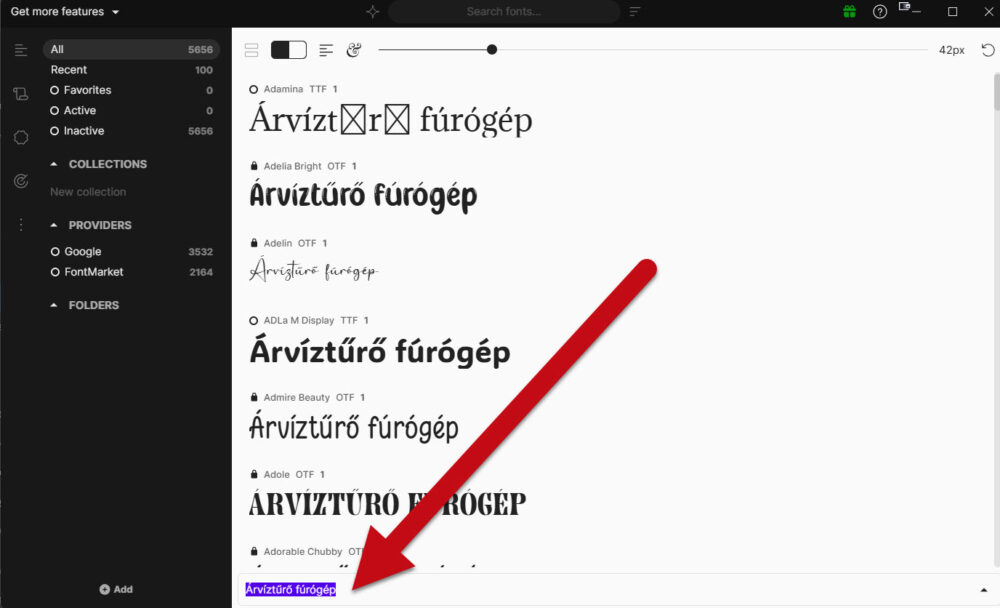 Nézzük tovább a program nyitóoldalát. Középen terül el a lényeg, a betűtípusok listája. Alapértelmezésben a klasszikus „The quick brown fox…” mondatot látod, de bármire átírhatod. Két dolgot érdemes ide bepötyögni. Vagy a konkrét címet, szöveg egy részét, amit tervezel, vagy az „Árvíztűrő tükörfúrógép” tesztmondatot. Utóbbival egy másodperc alatt kiszűrheted, melyik betű vérzik el a magyar ékezeteknél, és melyik az, amiben az „ő” és „ű”, stb. is megtalálható.