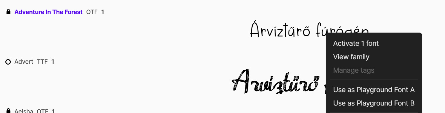 Még egy klassz funkciót muszáj megemlíteni, ez a Playground. Jobb klikkre megjelenő ablakban kiválaszthatsz egy betűtípust, majd még egyet.