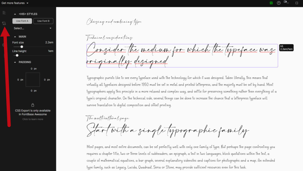 A bal oldali sávban a Playground ikonra kattintva, ez a két betűtípus jelenik meg egy felületen. Több méretben, így főcím, alcím, és folyószövegként is láthatod. Ha egyik doboz sincs kijelölve, egységesen állíthatod, ha kiválasztod valamelyik betűtípust, akkor csak annak méretét, stb. tudod módosítani. Természetesen saját szöveget is beírhatsz. Így könnyen tudod tesztelni, hogy mennyire működik jól a két betű párosítása.