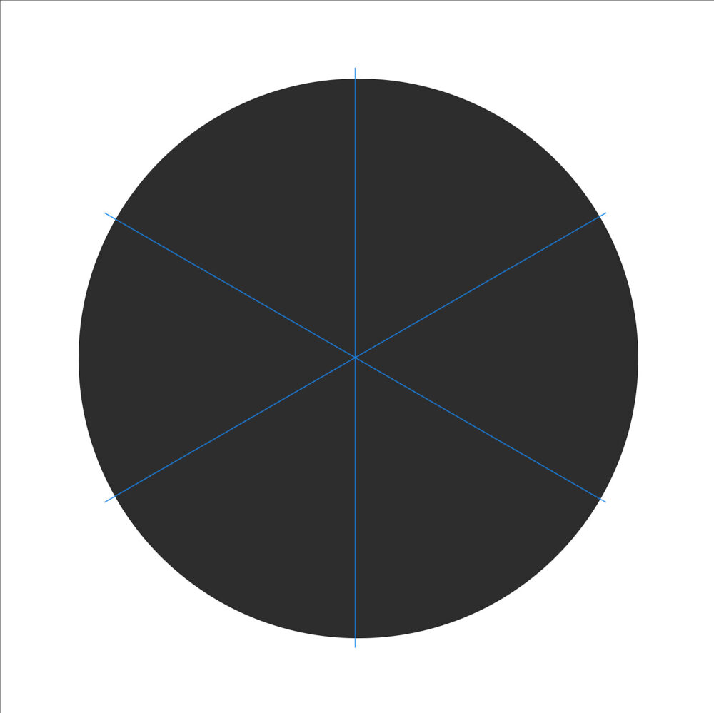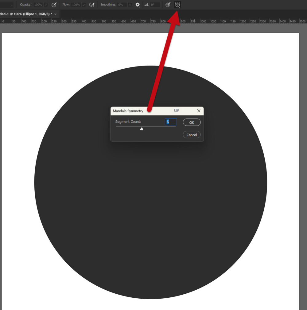 Válaszd a Brush Tool-t (Ecset), állíts be egy kemény ecsetet, a mérete akkora legyen, amekkora hézagot szeretnél a körcikkelyek között. Kattints a szimmetria ikonra, válaszd a Mandela opciót, és állíts be annyi szegmenst, ahány részre osztanád.