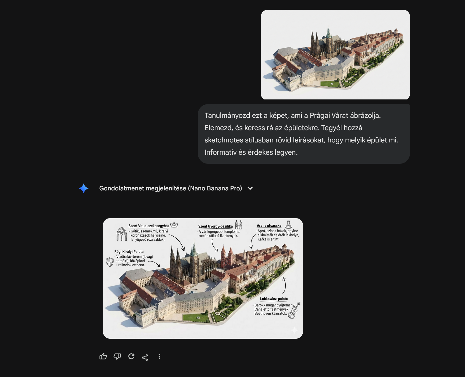 Itt nem álltam meg, hogy ugyanis a sima Google Gemini-ben a gondolkodó (thinking) mód nem csak válaszol, hanem elemzi a bemenetet: lehet az szöveg, dokumentum, PDF, videó vagy akár egy kép. Először ebből készít egy tömör, célzott összefoglalót – attól függően, hogy milyen közönségnek szánod, lehet akár gyerekeknek is –, majd ugyanabban a beszélgetésben, a képgenerálás bekapcsolása után, egy második prompttal vizuális formába alakítja át az egészet. Így lesz egy videóból vagy dokumentumból áttekinthető, sketchnote-szerű grafika, ami fotókönyvben kifejezetten jól mutat: informatív, látványos, és nem csak díszít, hanem mesél is. Nekem nem is kellett két prompt hozzá, elég egyértelmű volt a kép, ez nem egy 20 oldalas dokumentum:) A grafikát ugyanúgy a Nano Banana Pro készíti.