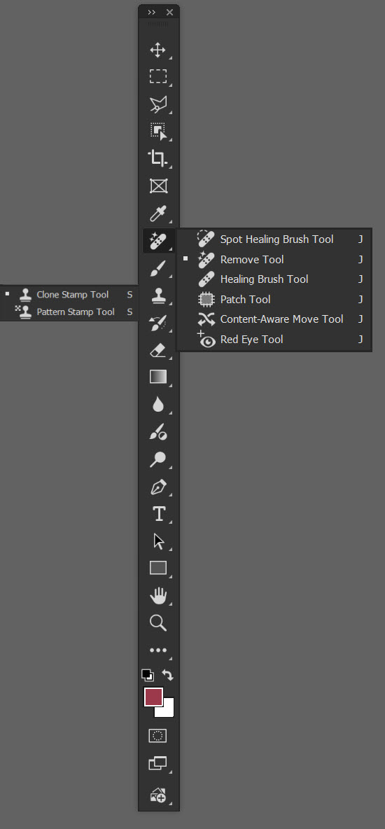 Bal oldalt a régi cikkből, a jobb oldalon a jelenlegi Photoshop. Láthatod, hogy a Clone Tool-nál semmi változás nincs. A másik retusáló csoportba bekerült a Remove Tool és a Content-Aware Move Tool.