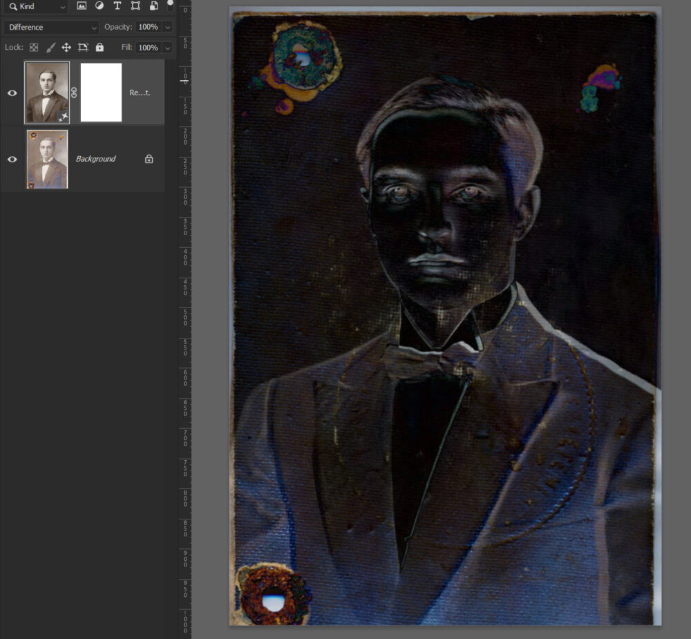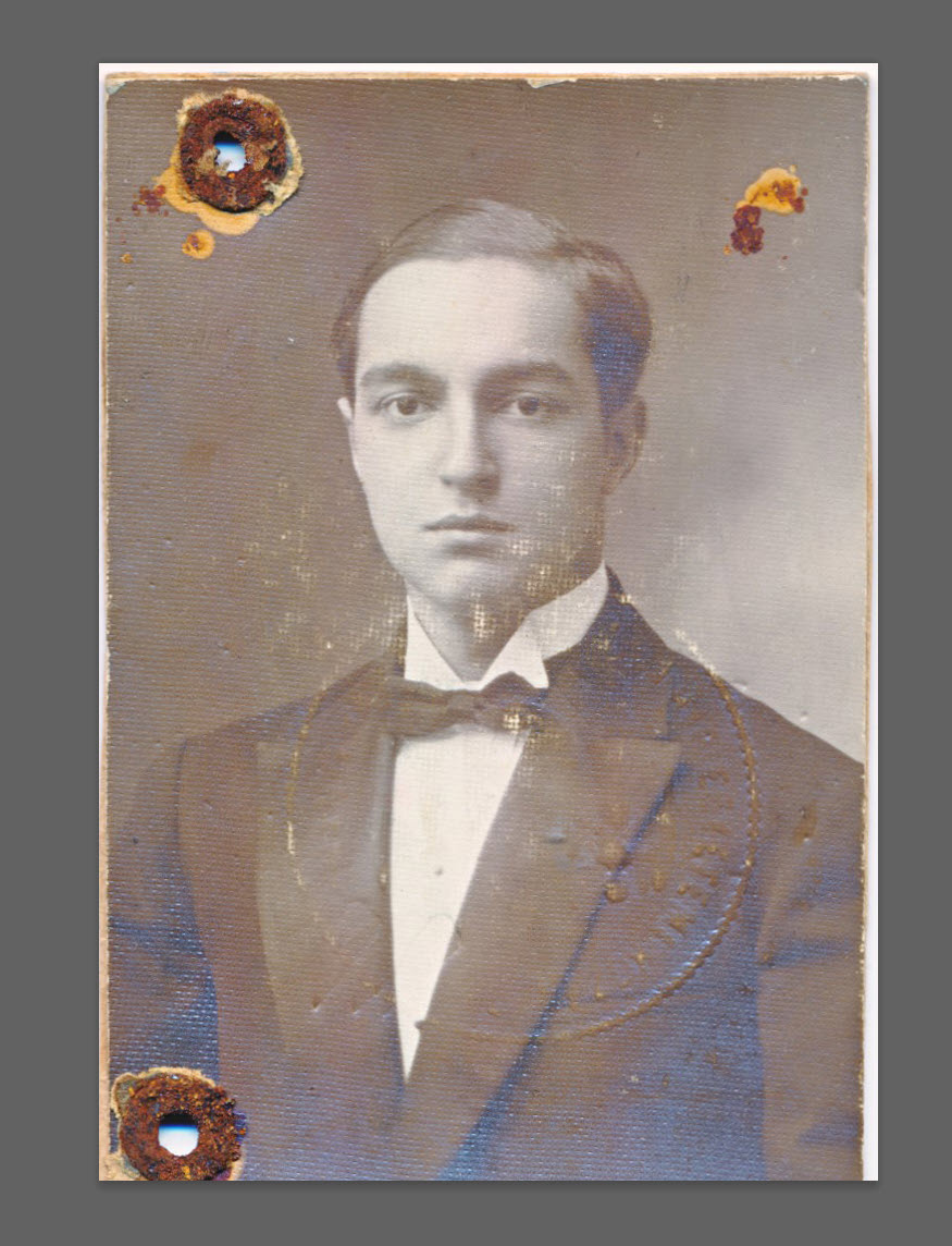 Retusáld a fotót: távolítsd el a széleken lévő rozsdás lyukakat és a kör alakú pecsétnyomot. Szüntesd meg a papír raszterességét és textúráját, simítsd ki a felületet, miközben megőrzöd az arc élességét és eredeti karakterét.