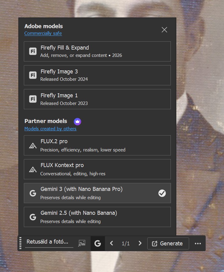 A Photoshop újabb verzióiban a Generatív kitöltés (Generative Fill) funkció már nemcsak az Adobe saját Firefly modelljeit használja, hanem választhatunk külső partner-modelleket is. Ezek közül a Gemini 3 Nano Banana Pro az, ami elképesztő precizitással kezeli a régi fotók restaurálását.