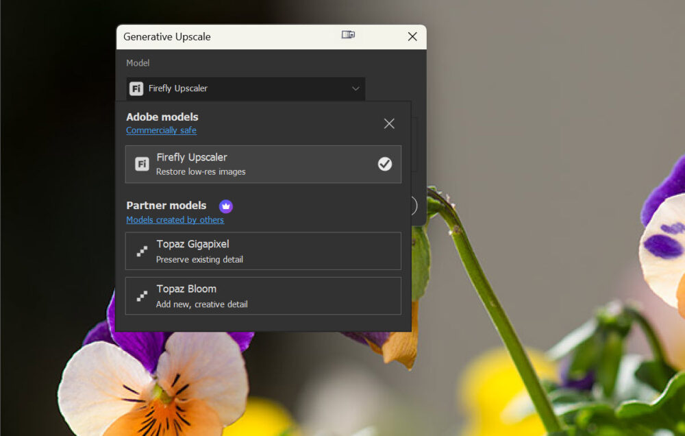 Amint kiválasztod az Image > Generative Upscale (Kép > Generatív felskálázás) menüpontot, megjelenik egy külön ablak. A legördülő listában nemcsak az Adobe saját Firefly Upscaler modellje látszik, hanem a partnermodellek is, köztük a Topaz Gigapixel és a Topaz Bloom. Már itt jól látszik, hogy a három megoldás nem ugyanarra való: a Firefly inkább általános felskálázásra készült, a Gigapixel a meglévő részletek megőrzésére fókuszál, míg a Bloom új, kreatív részleteket ad hozzá a képhez.