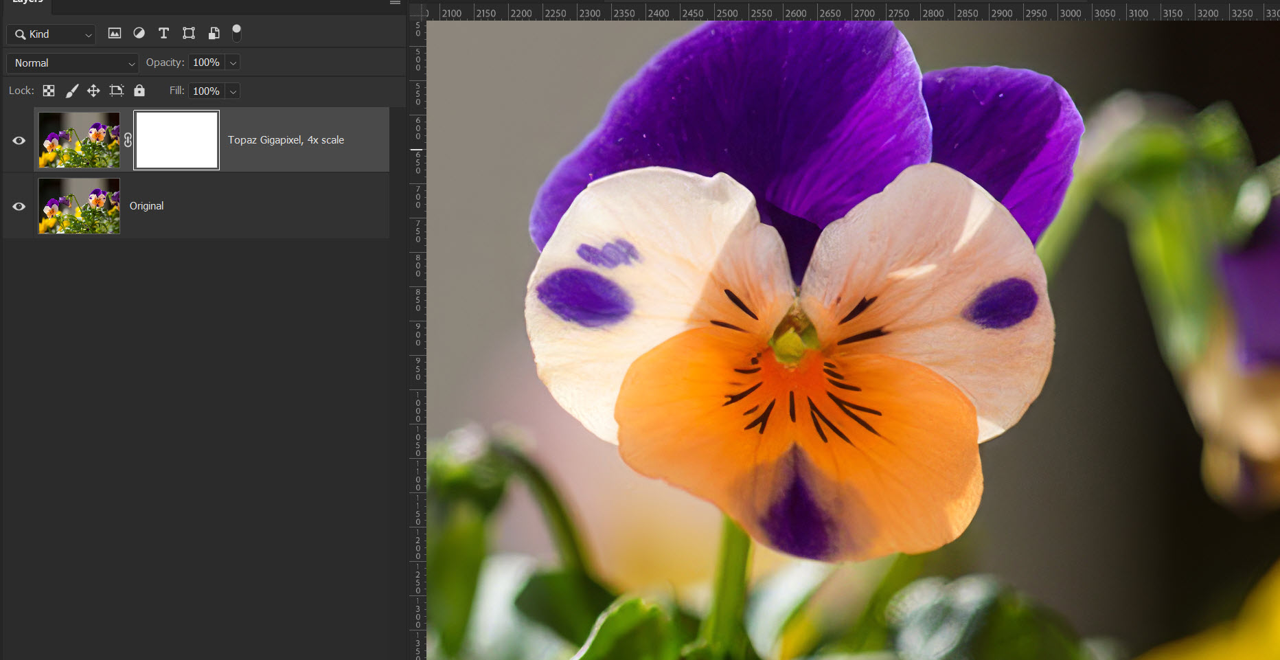 A Photoshop a felskálázott képet új dokumentumban nyitja meg, ahol az eredeti és az új változat külön rétegen van ott. A felső rétegen a Gigapixel által készített nagyított kép látszik, mellette pedig egy rétegmaszk van, így ha valahol az eredeti részlet tetszik jobban, azt könnyen vissza lehet hozni. A Gigapixel látványosan szebb és részletesebb eredményt ad, de nem kötelező mindent változtatás nélkül elfogadni.